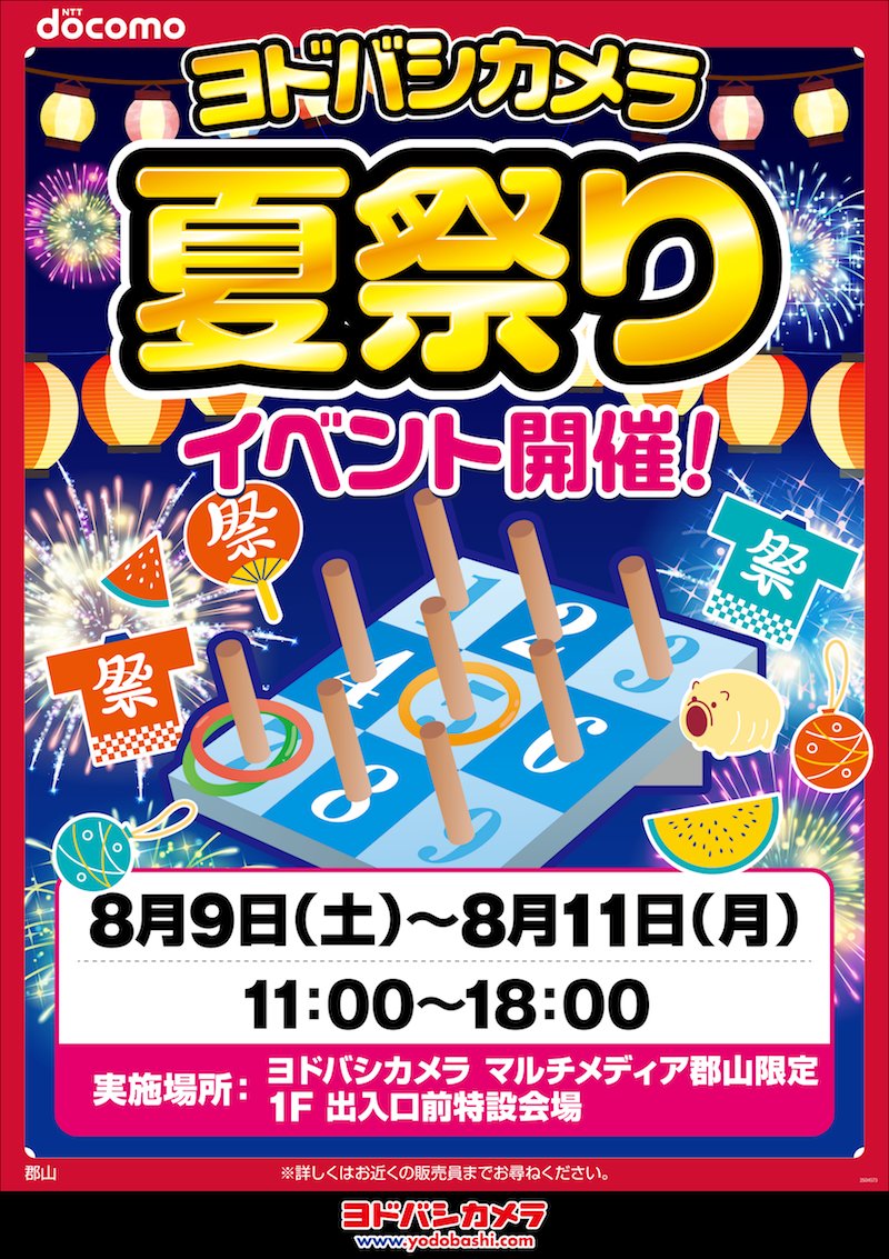 【楽しい夏祭りイベント開催】 1階駐車場側にて夏祭りイベントを開催します🎵 輪投げやスーパーボールすくいなど親子で楽しめるイベントです✨ 当店にお立ち寄りの際はぜひご参加ください💁 🗓8/9(土)~8/11(月) 🕙11:00~18:00 📍1階出入り口前特設会場 ➡yodobashi.com/ec/news/200009…