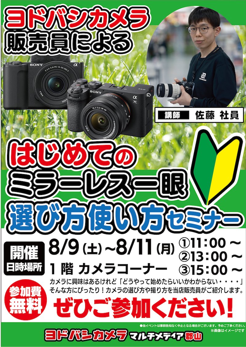 【☆イベント開催☆】 ヨドバシ郡山にて「はじめてのミラーレス一眼 選び方使い方セミナー」を開催✨ 気になる一眼カメラの選び方・使い方を販売員が解説🎵 無料でご参加いただけますのでぜひお立ち寄りください💁 🗓8/9(土)~8/11(月) 📍1階カメラコーナー ➡yodobashi.com/ec/news/200009…