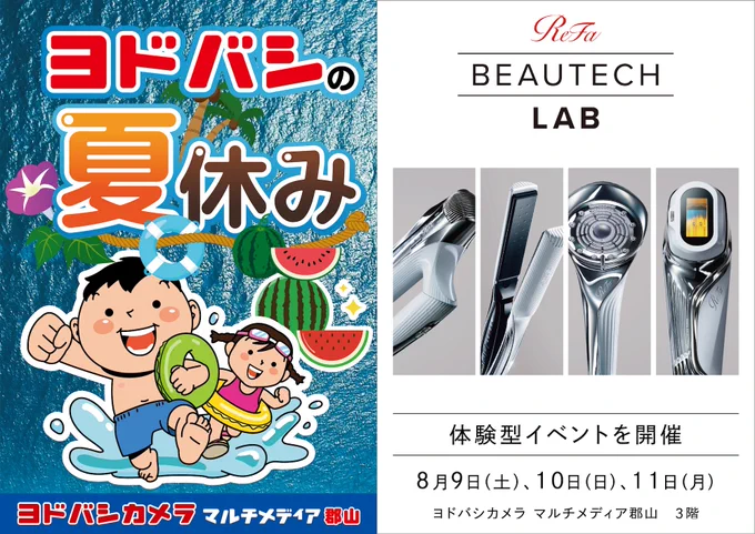 週末イベント第4弾‼️ 夏休み期間中は毎週末ヨドバシ郡山で楽しいイベントを実施中✨ 今週の目玉は 大人気ReFa製品の体験型イベントを開催🎵 ドライヤーやシャワーヘッド等を体験いただす👌 その他にもたくさんのイベントがありますので ぜひご来店ください💁 ➡yodobashi.com/ec/store/0053/