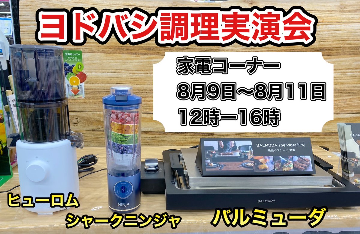 【イベント開催】 8/9(土)~8/11(月)の3連休 2階家電コーナーでは調理実演イベントを開催‼️ バルミューダのホットプレートや コードレスミキサーと ジューサーを使った実演を行います✨ 違いを実際にお試しください💁 ➡yodobashi.com/ec/news/200009…