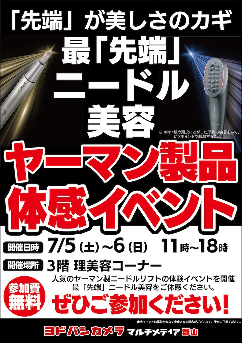 【ヤーマン製ニードルリフト体感イベント開催】 最新の美容機器をお試しいただけます🎵 ぜひお越しください 🗓7/5(土)7/6(日) 🕙11:00~18:00 📍3階 理美容コーナー ➡yodobashi.com/ec/news/200009…