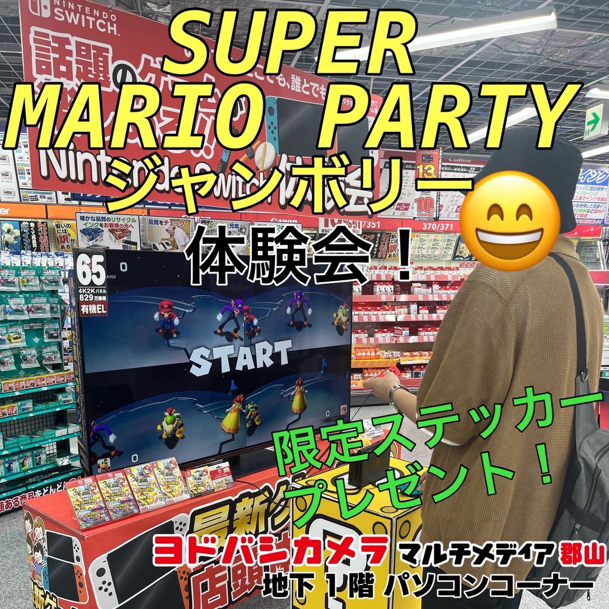 【話題のゲームが楽しめる体験会❗️】 「マリオパーティジャンボリー」体験会を開催しています✨ 体験してくれた方には,ここでしか手に入らない限定ステッカーをプレゼント🎁 この機会にぜひご家族やお友達と遊びに来てください💁 ➡yodobashi.com/?word=%E3%83%9…