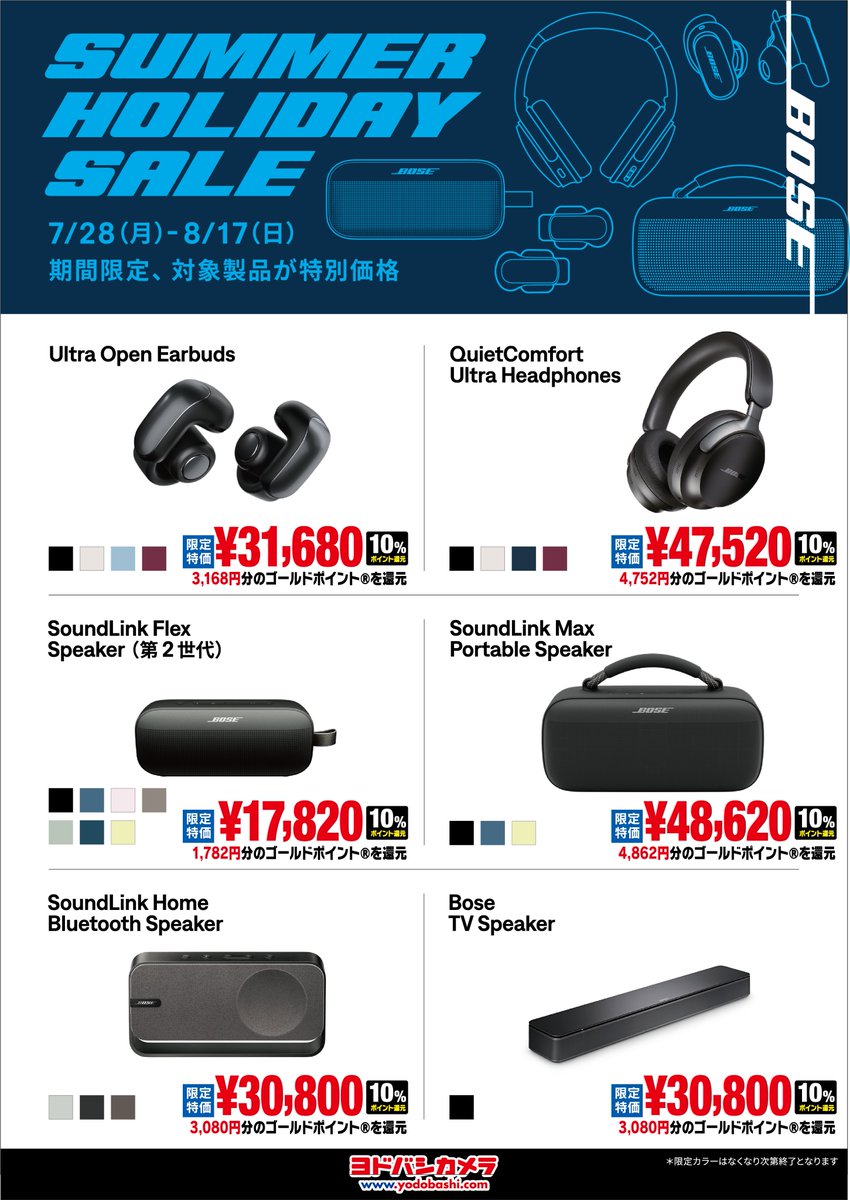 【BOSE製品がお買い得‼】 BOSE SUMMER HOLIDAY SALE開催中📢 迫力ある音で人気の商品が 大特価でお買得🎵 8/17(日)までの期間限定価格です🙌 ぜひお越しください🤗 📍3階オーディオコーナー ➡yodobashi.com/maker/00000011…