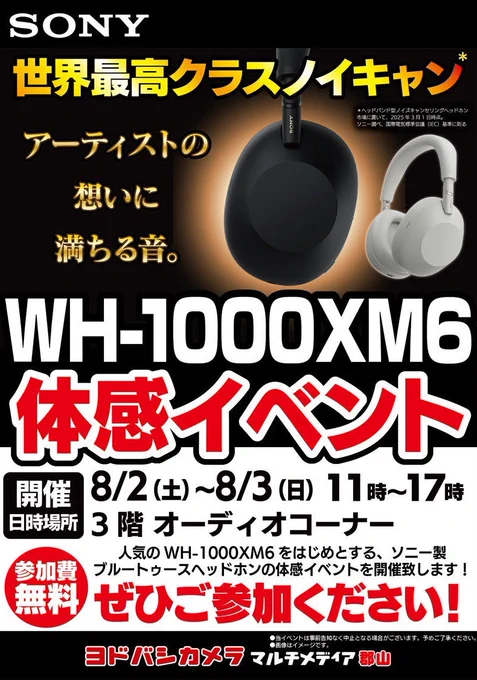 ソニー Bluetoothヘッドホン 体感イベントを開催‼️ 業界最高クラスのノイズキャンセリング機能搭載モデルから 軽量コンパクトなカジュアルモデルまで お試しいただけます🎵 🗓8/2(土)8/3(日) 🕙11:00~17:00 📍3階 オーディオコーナー ➡