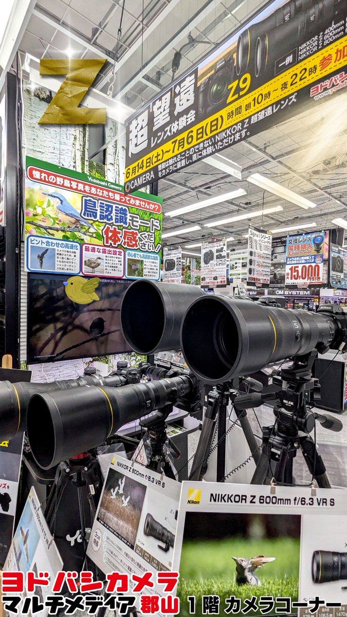 【イベント情報】 ニコンのNIKKOR Z超望遠レンズをZ9、Z7Ⅱ、Z6Ⅲ、Z6Ⅱに装着して試せるイベントを開催✨ ヨドバシ郡山店1階カメラコーナーで 最新レンズの描写力と性能をぜひご体験ください🎵 🗓6/14(土)~7/6(日) ➡yodobashi.com/ec/news/200008…