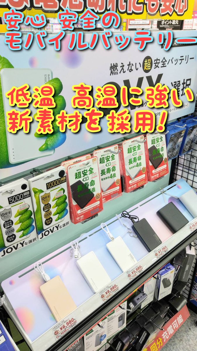 【夏も冬も頼れる!安心バッテリー】 低温・高温に強い準固体電池やナトリウムイオン電池を採用❗️新素材で安心・長寿命なモバイルバッテリーです💁 普段使いはもちろん、防災対策としてもおすすめです❗️ ヨドバシ郡山で実機展示中‼️ぜひご覧ください😊 ➡️yodobashi.com/category/17410…
