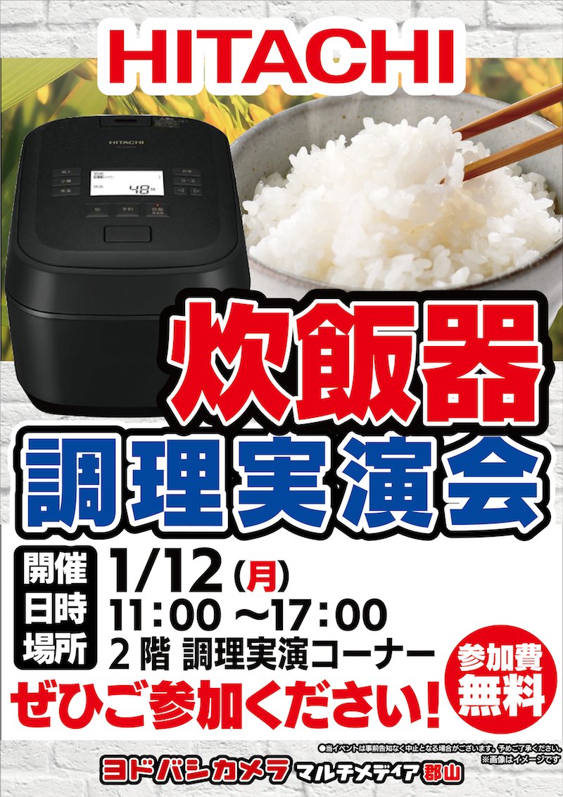 \調理実演会開催❗️/ 日立の炊飯器の調理実演会を開催します。 驚きの甘みと粒立ち。のどごしするり「圧騰甘み炊き」 米老舗八代目儀兵衛の土鍋釜の炊き技を炊飯器の技術で実現🍚 ぜひご体感ください😊 🗓️1/12(月・祝)🕙11:00~17:00 📍2階調理家電コーナー ➡️