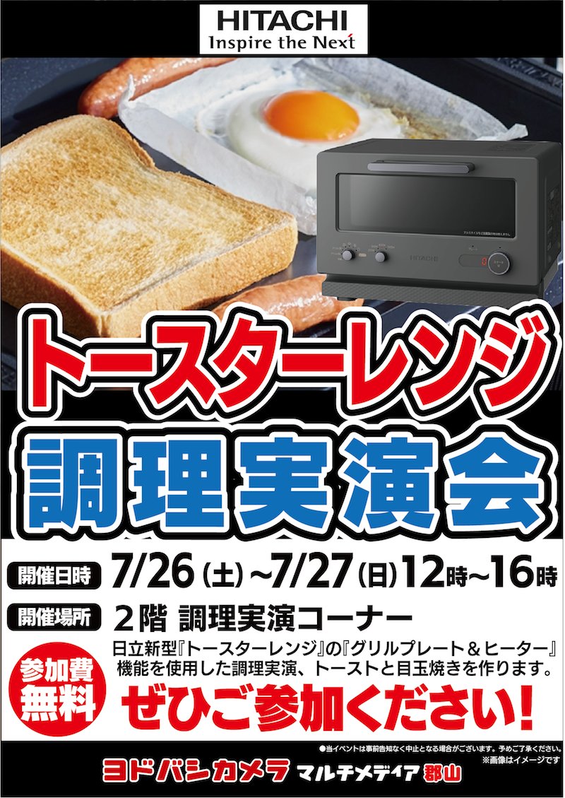 / 日立トースターレンジ 実演会開催! \ トースターと単機能レンジを組み合わせた最新家電✨ 今回は専用プレートを使用して、トーストと目玉焼きのを同時調理を行います🎵 ぜひお越しください💁 🗓7/26(土)~7/27(日) 🕙12:00~16:00 📍2階 家電コーナー ➡yodobashi.com/ec/news/200009…