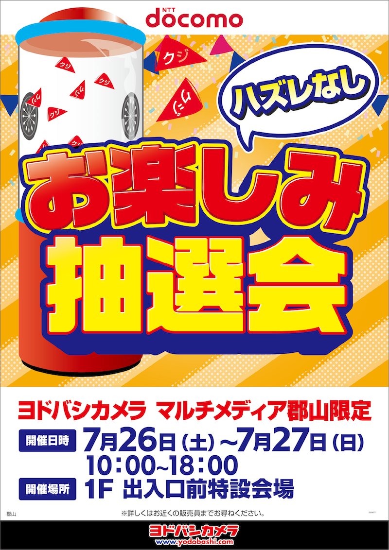 【週末限定 抽選会のお知らせ】 7/26~7/27の2日間、ヨドバシ郡山にて エアーくじの抽選会を開催します🎉 舞い上がるくじをつかみ取れ🤲 家族で楽しめるイベントです😉 皆さまのご来店お待ちしております❗️💁 🕙10:00~18:00 📍1階出入口前特設会場 ➡️yodobashi.com/ec/news/200009…