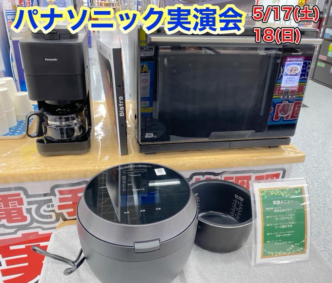 【調理実演イベント開催】 パナソニックの炊飯器と オーブンレンジの調理実演会を開催✨ 今回はチーズカツレツ等を作ります🎵 また大人気の最新コーヒーメーカーの実演も開催☕ ぜひお立ち寄りください💁 📅5/17(土)~5/18(日) 🕙11:00~17:00 📍2階家電コーナー ➡