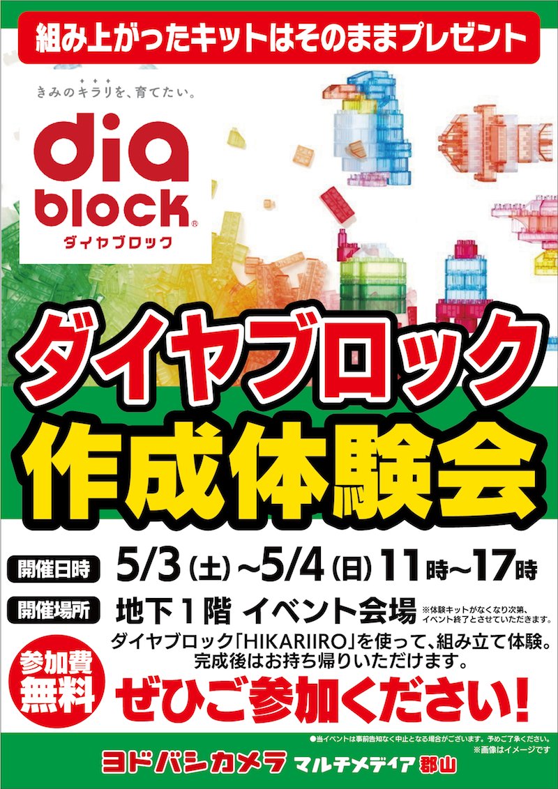 【GWイベントのご案内】 ダイヤブロック組立体験会開催中✨ 参加費無料、体験会で作成したキットは そのままお持ち帰りいただけます🎵 ぜひご参加ください💁 🗓5/3(土)~5/4(日) 🕙11:00~17:00 📍地下1特設コーナー ➡yodobashi.com/?word=%E3%83%8…