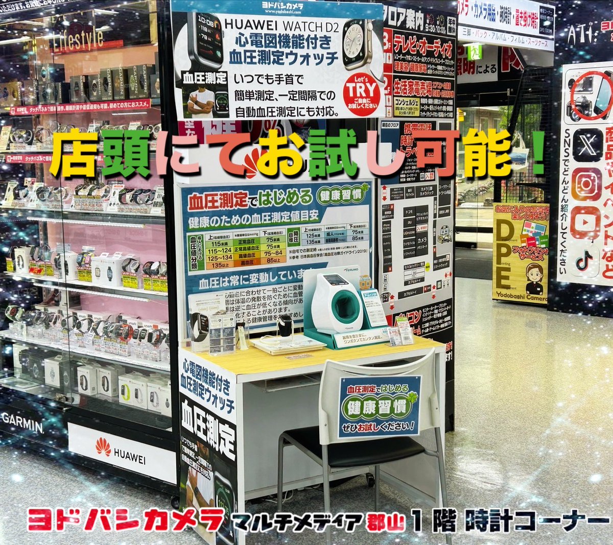 【速報】 HUAWEI WATCH D2血圧測定体験コーナーが登場✨ 最新スマートウォッチで手軽に血圧チェックしませんか❓ ぜひ1階時計コーナーにてお試しください🎵 ➡yodobashi.com/product/100000…