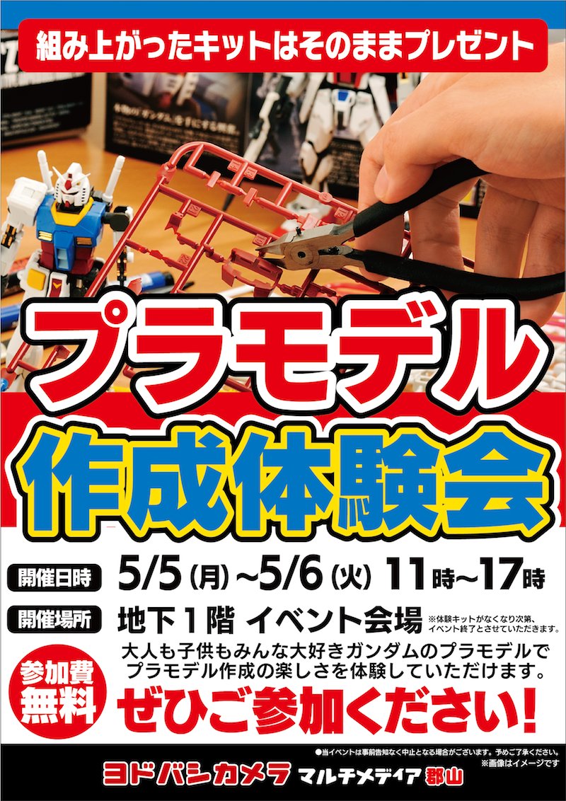 【イベントのご案内】 プラモデル組立体験会を開催いたします‼️ 参加費無料で、体験会で作成したキットはそのままお持ち帰りいただけます💁 ぜひご参加ください😊 🗓️5/5(月・祝)~5/6(火) 🕙11時~17時まで 地下1階 特設コーナーにて 🏬yodobashi.com/ec/store/0053/