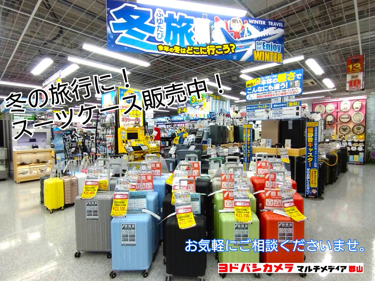 ヨドバシ郡山では冬の旅行にオススメの スーツケースを販売中🧳 軽量タイプから頑丈な物まで、旅行日数に合わせて 品揃え豊富にご用意しております✨ ご購入のご相談は当店1階スーツケースコーナーまで お立ち寄りください💁 ➡