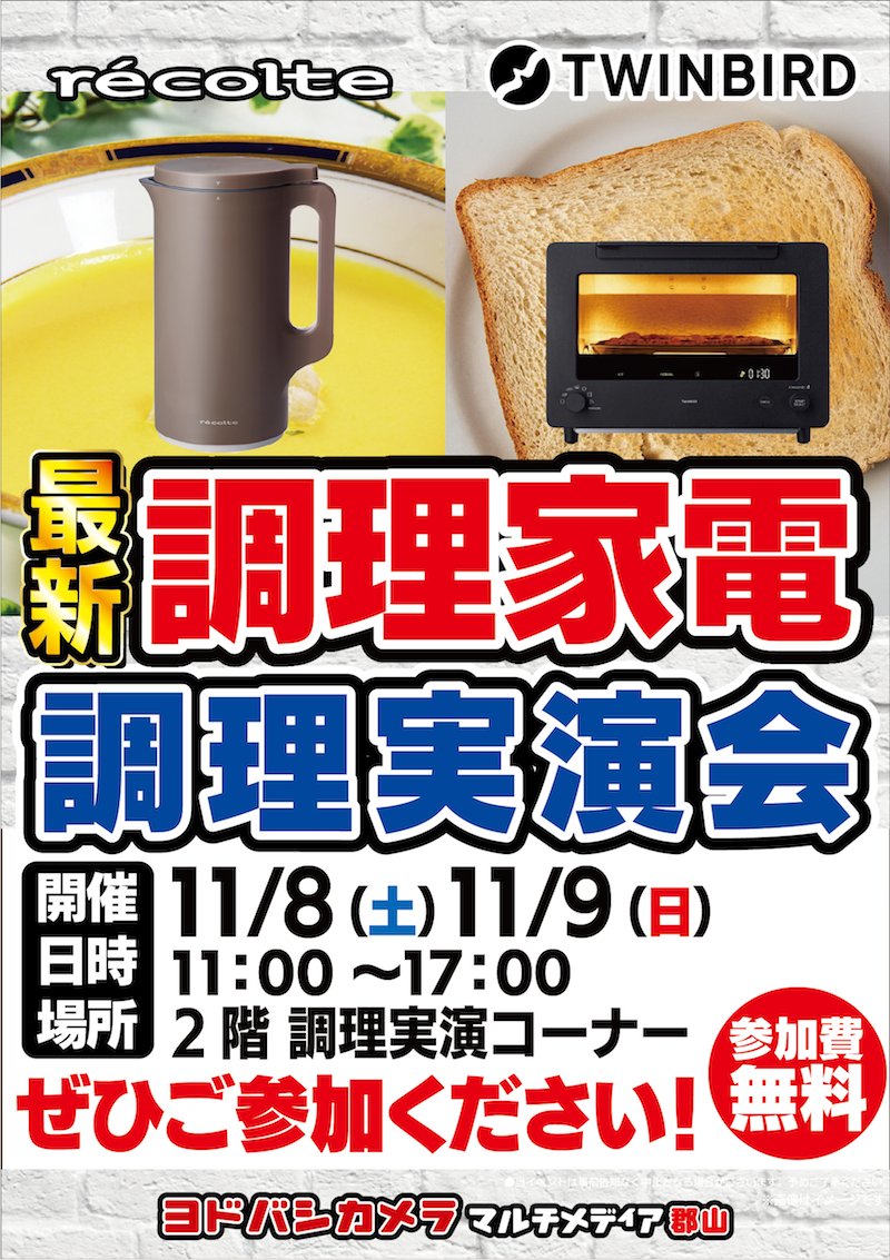 【本日、明日開催❗️】 レコルト&ツインバードの調理実演イベント🍽️ レコルトは自動調理ポットを使い、簡単にできるスープの調理実演を。 ツインバードはオーブントースターを使い、冷凍食パンをふっくらと美味しくトーストします🧇 ぜひ📍2階 調理実演コーナーまで💁