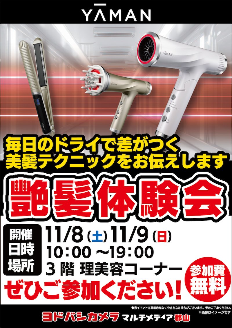 \理美容家電体験会開催✨/ ヤーマンの最新リフトドライヤーやヘアアイロンなど、最新のヘアケア理美容家電をお試しいただける艶髪体験会を開催します❗️ お客様のお悩みにあった商品を専門知識豊富なスタッフがご提案します💁 🗓️11/8(土)9(日) 🕙10:00~19:00 ➡️