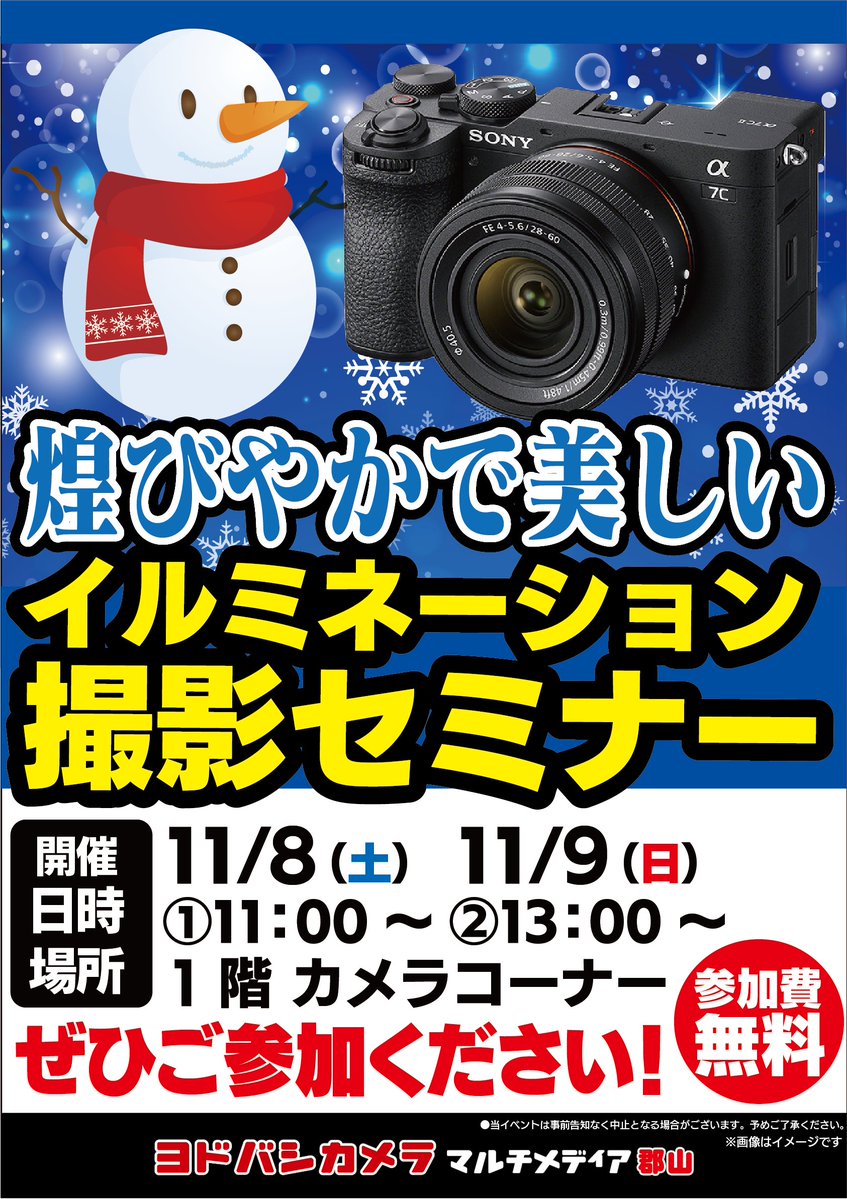 / ミラーレス一眼 イルミネーション撮影セミナー開催 \ 当店カメラ販売員が イルミネーションの撮影方法を紹介します✨ 参加費は無料❗️ この機会にぜひご参加ください🎵 🗓11/8(土)11/9(日) 🕙①11:00~ ②13:00~ 📍1階 カメラコーナー 🏬
