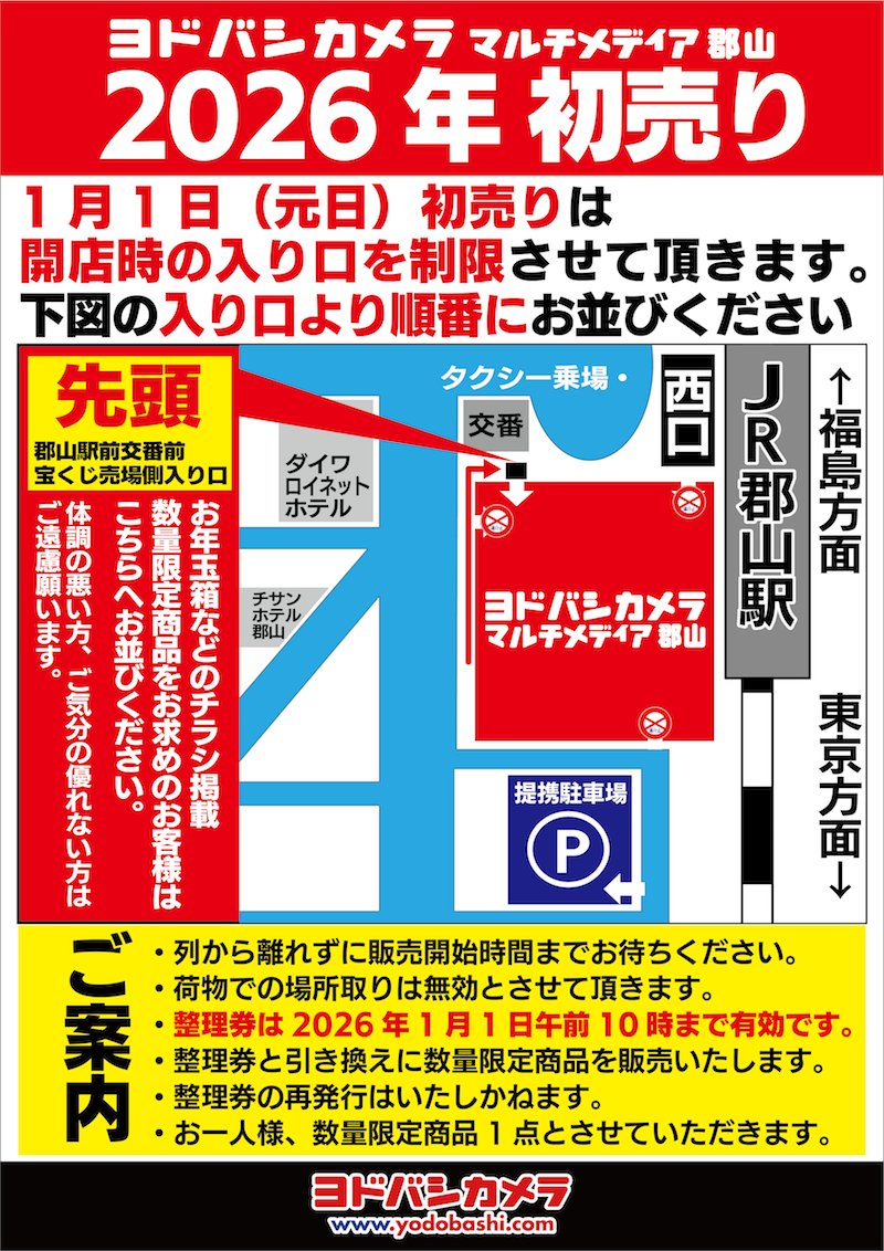 2025年もヨドバシ郡山をご利用いただき ありがとうございます🙇 新春初売りは元日8時~ 夢のお年玉箱やお買得な商品を 多数ご用意しております✨ 店頭に並ばれる場合は宝くじ売り場側から 詳細は画像をご確認ください👇 2026年もよろしくお願いいたします❗️