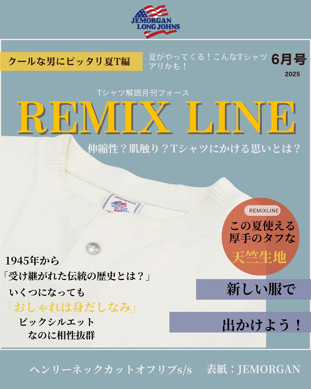 1945年にペンシルバニア州で小さな町の縫製工場として設立されました。 スタートはアウトドア用のインナー製品として着用され、その最高水準の機能性とフィット性が認められ 国際的なスポーツチームや米軍のインナーとしても 採用されました。 90年代に入るとアメリカンカジュアルのファッション アイテムとして一般的に着用されるようになりました。 「 サーマルと言えばJEMORGAN 」と言われるほど 世界的にそのブランド名は浸透していき、保温性・ 伸縮性・ 肌触りの良さなど最高品質のサーマルウェアとして 広く知られています。 世代を問わず幅広い着こなしができる多様性のある商品です。 【商品紹介】 厚手のタフな天竺生地を使用したビッグサイズの 半袖Tです。 リブには特徴ある編地の針抜きリブを使用し、袖口と裾はカットオフ仕様です。 左胸には便利なポケット付きです。 コンチョ風の1つボタンがポイントです。 人とは違う個性的なアイテムが好きな方に是非おすすめですし厚手でしっかりした生地なのにクール感もあります。 是非リミックスラインにお越しください。 #remixline #郡山 #福島県 #アパレル