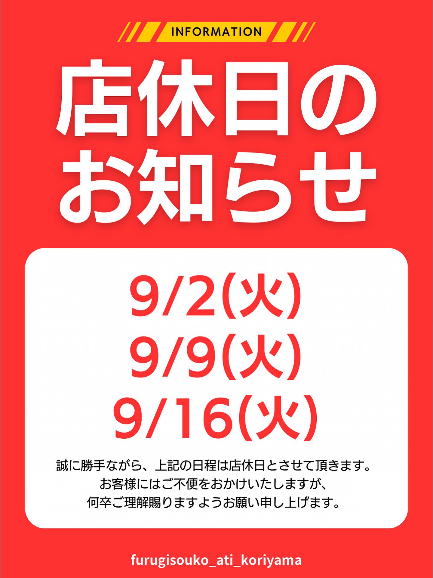 -古着倉庫Ati郡山店よりお知らせ- 誠に勝手ながら、上記の日程は店休日とさせて頂きます。 お客様にはご不便をおかけいたしますが、 何卒ご理解賜りますようお願い申し上げます。 #古着 #古着屋 #福島古着屋 #郡山古着屋 #古着倉庫米沢 #古着倉庫 #郡山駅前 #郡山 #郡山市 #いわき #白河市 #須賀川市 #いわき市 #二本松市 #新潟 #会津若松