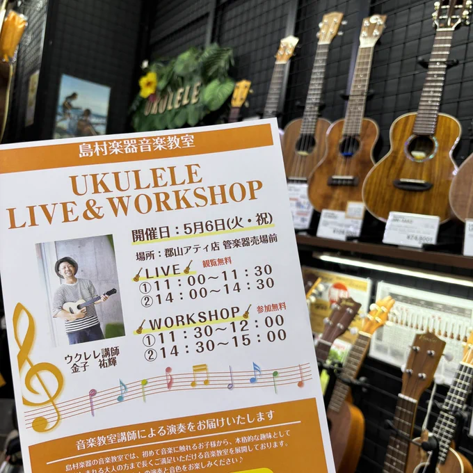 【イベント情報】 金子祐輝先生のウクレレLIVE&ワークショップ開催!! 5/6(火・休) LIVE ①11時〜②14時〜 workshop①11:30〜②14:30〜 参加は無料✨ ご予約お問い合わせは当店まで! 詳しくはこちら 🔗 イベント #ウクレレ