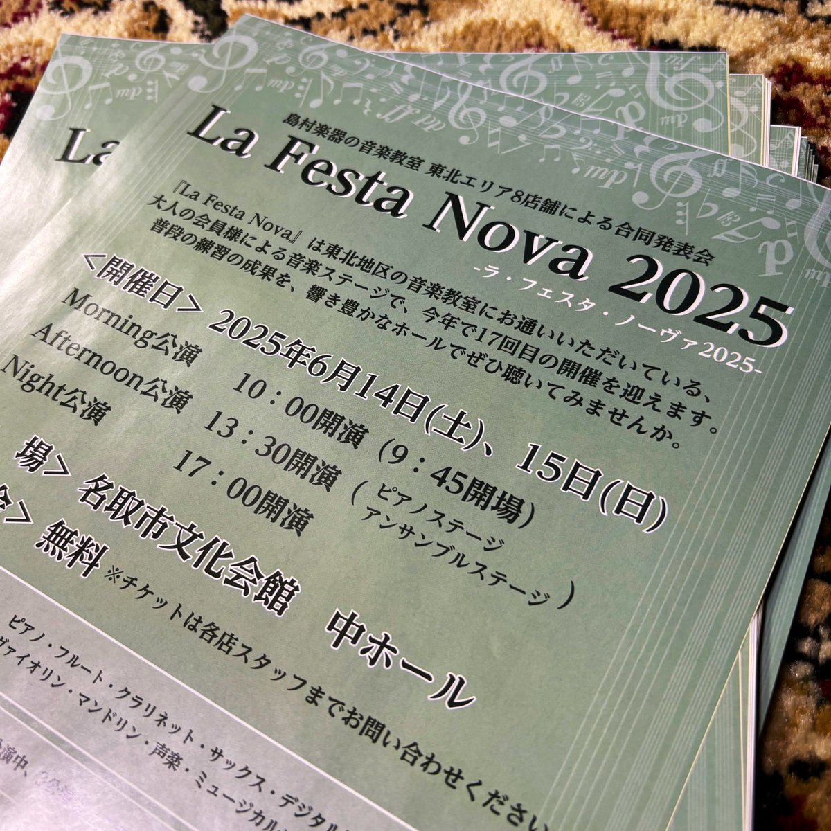 【イベント情報】 島村楽器東北地区の合同発表会🎻 『La Festa Nova 2025』 6月14日(土)・15日(日)開催‼️ 名取市文化会館のホールで生徒様の演奏はもちろん、講師・インストラクターによる演奏も楽しめます♪ 入場無料💡 チケットはレジにて配布中です♪ #LFN25 #LaFestaNova2025