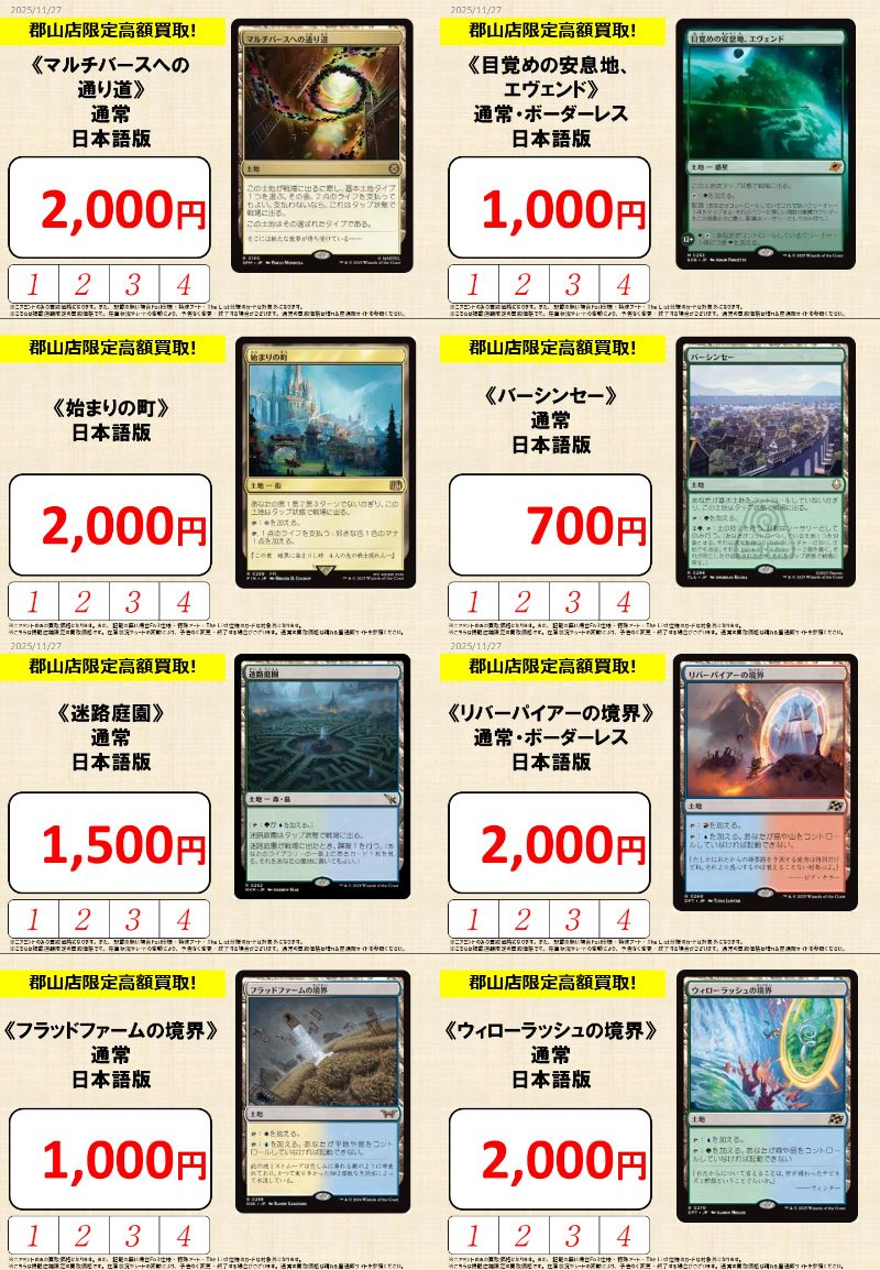【買取情報】 『晴れる屋 郡山店』限定買取更新しました‼️ 《マルチバースへの通り道》2,000円 《目覚めの安息地、エヴェンド》1,000円 《フラッドファームの境界》1,000円 《リバーパイアーの境界》2,000円 スリーブ抜き&ソート不要🙌 ぜひ晴れる屋郡山店にお持ち込みください🙇♂️