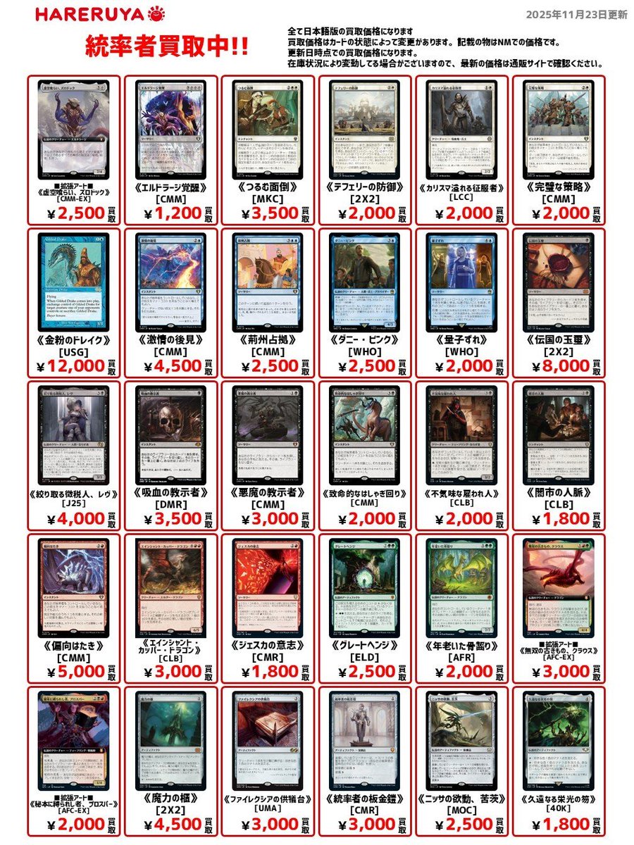 【買取情報】 👑統率者買取募集中👑 日本語版の参考買取価格はコチラ🔽 《金粉のドレイク》[USG] ¥12,000 《偏向はたき》[CMM] ¥5,000 《激情の後見》[CMM] ¥4,500 《テフェリーの防御》[2X2] ¥2,000 1枚からでも査定は🆗 スリーブ抜きやソートも不要です👍 皆様のご来店お待ちしております🙇♀️