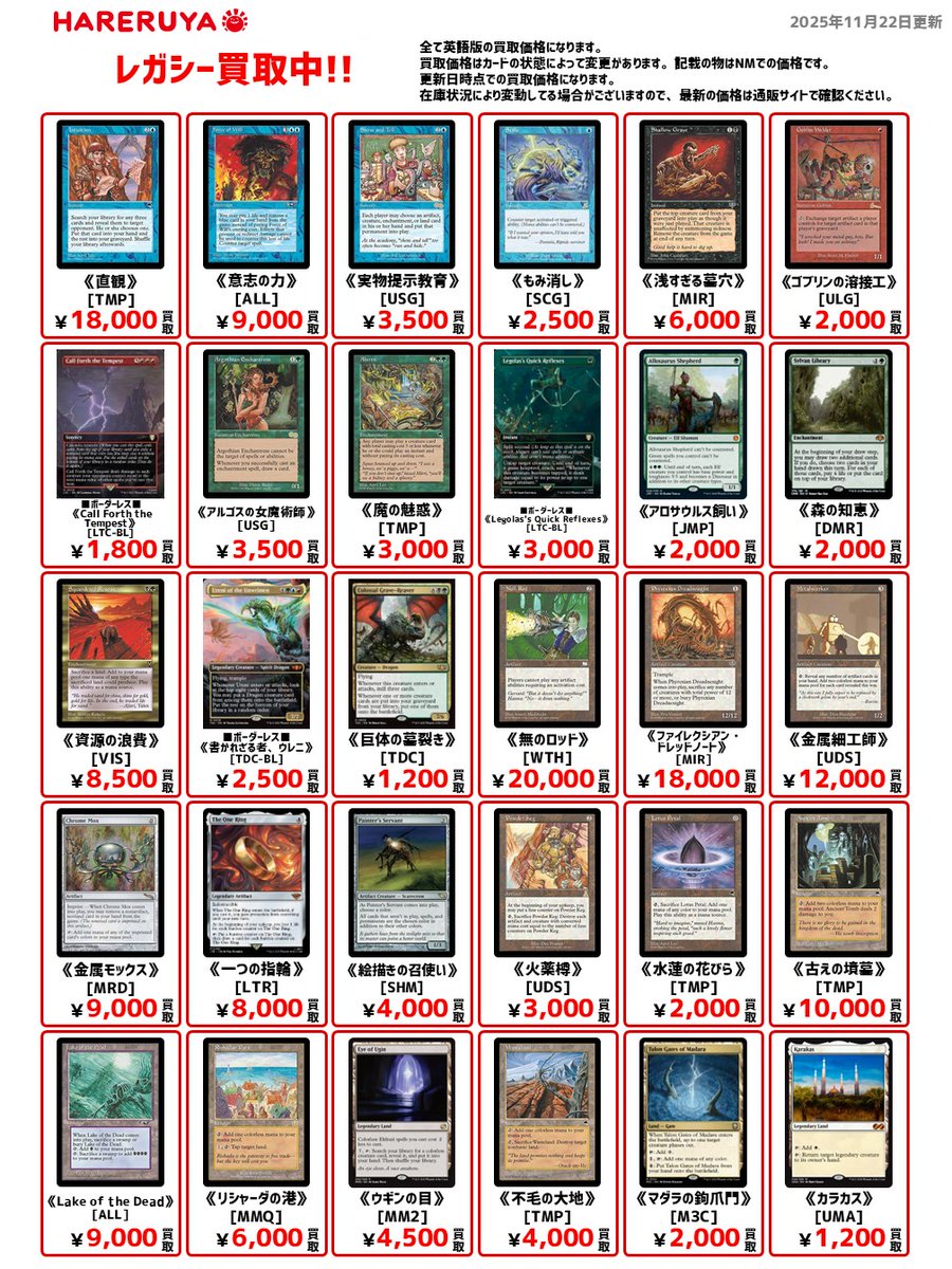 【買取情報】 🏛️レガシー買取募集中🏛️ 🎯英語版の注目価格はこちら🎯 《ファイレクシアン・ドレッドノート》[MIR] ¥18,000 《金属細工師》[UDS] ¥12,000 《資源の浪費》[VIS] ¥8,500 《浅すぎる墓穴》[MIR] ¥6,000 1枚でも多数でも大歓迎です‼️ 皆様のお持ち込み、お待ちしております🙏