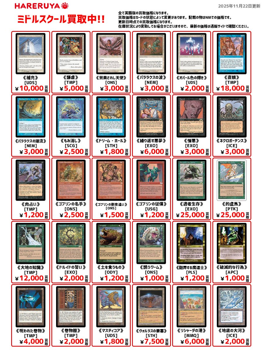 【買取情報】 🌲ミドルスクール買取募集中🌲 英語版の参考価格(状態NM)はコチラ⏬ 《適者生存》[EXO] ¥25,000 《大地の知識》[TMP] ¥12,000 《リシャーダの港》[MMQ] ¥6,000 《ネクロポーテンス》[ICE] ¥3,000 スリーブ抜きやソートはしなくて🆗👌 お気軽にお持ち込みください🎵