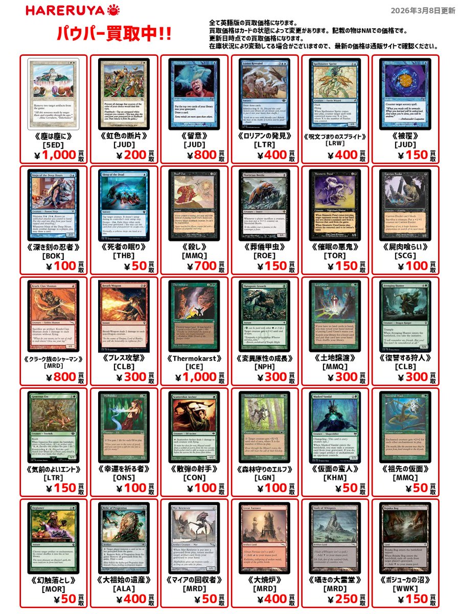 【買取情報】 👴パウパー買取募集中👴 英語版の参考価格はコチラ🔽 《塵は塵に》[5ED] ¥1,000 《留意》[JUD] ¥800 《ロリアンの発見》[LTR] ¥400 《催眠の悪鬼》[TOR] ¥150 《散弾の射手》[CON] ¥100 自室のストレージに眠っているかも⁉️ ぜひ『晴れる屋郡山店』までお持ち込みください😁