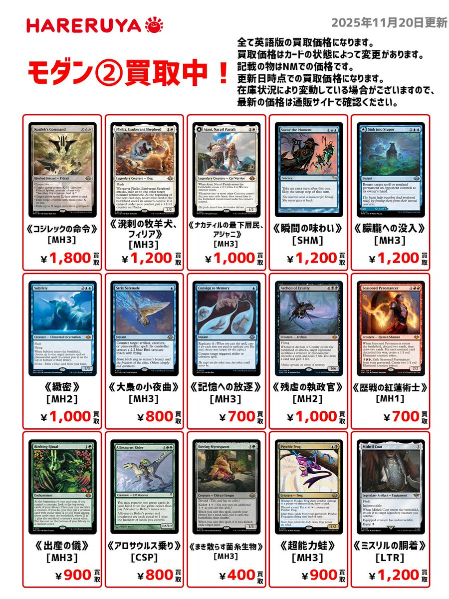 【買取情報】 モダン範囲のカード募集中です‼️ 《コジレックの命令》[MH3] 1,800円買取 《溌剌の牧羊犬、フィリア》[MH3] 1,200円買取 《瞬間の味わい》[SHM] 1,200円買取 《朦朧への没入》[MH3] 1,200円買取 お持ち込みの際はスリーブ抜き&ソート不要🙌 晴れる屋郡山店にてお待ちしています🙆