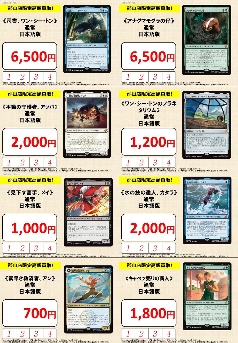 【買取情報】 『アバター 伝説の少年アン』限定買取更新しました‼️ 🎯注目のカード🎯 《アナグマモグラの仔》¥6,500 《不動の守護者、アッパ》 ¥2,000 《見下す高手、メイ》¥1,000 《素早き救済者、アン》¥700 『晴れる屋郡山店』までお持ち込みください😆