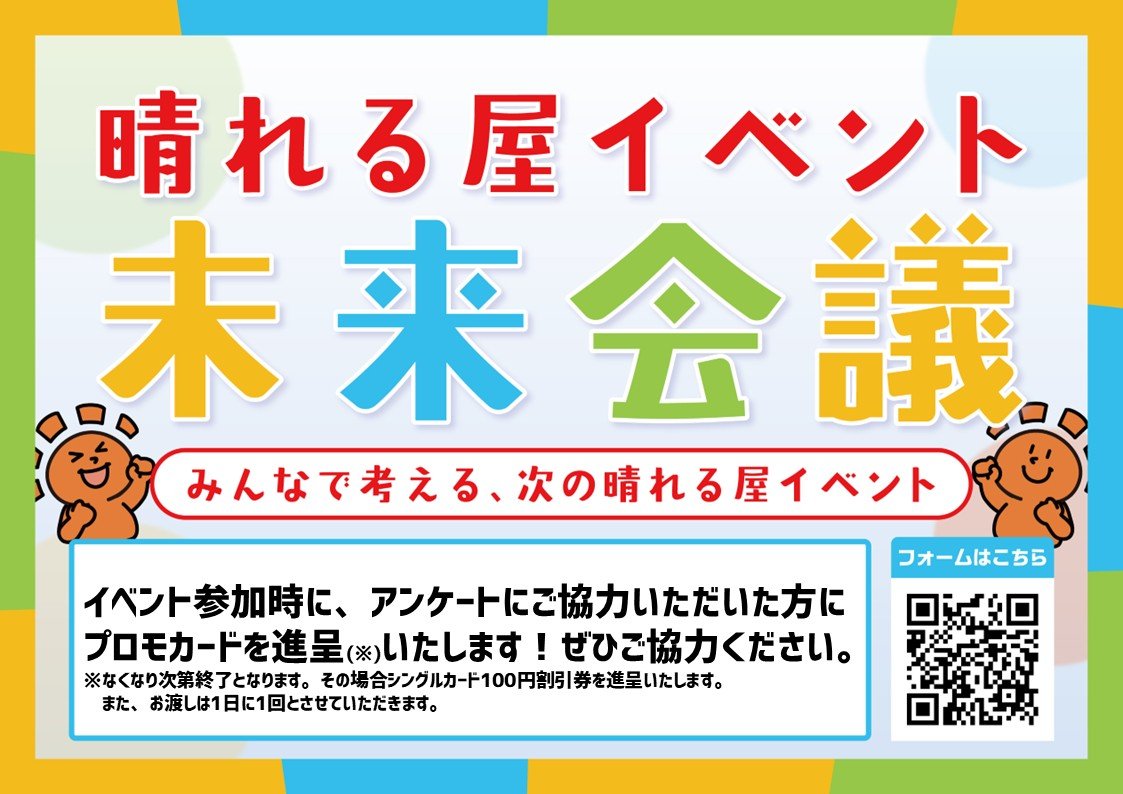 【お知らせ】 \皆さんの声、聞かせてください/ 只今晴れる屋郡山店 でも 『晴れる屋イベント未来会議』アンケートを 大会カウンターにて実施中✨ イベント参加&アンケート回答でプロモカードを進呈🎁 ※回答は1日1回まで アンケート&イベントへのご参加をお待ちしてます😆