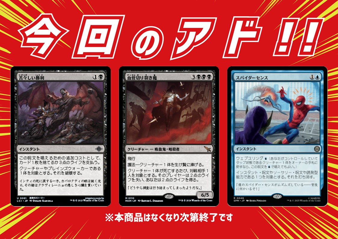 【#晴れ郡商品情報】 ✨「アドクレーン」新ロット補充‼️✨ 今回のアドはこちら🔽 《血管切り裂き魔》 《苦々しい勝利》 《スパイダーセンス》 パックのほか、シールやサプライも気合を込めて入れました🔥 1回1⃣0⃣0⃣円でレッツチャレンジ🎵 皆さまの挑戦お待ちしております🙇