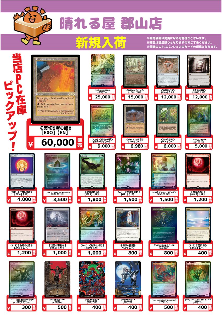【商品情報】#晴れ郡PC新入荷 晴れる屋郡山店のPCシングル新入荷のお知らせです✨ 🎯注目カードピックアップ🎯 《裏切り者の都》EN ¥60,000 《Willow Satyr》EN¥15,000 なんとNMの裏切り者の都を入荷しました✨ 🔽晴れる屋郡山店の新商品はこちらから🔽