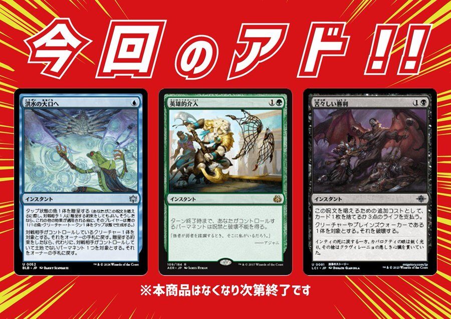 【#晴れ郡商品情報】 人気筐体「アドクレーン」好評稼働中‼️ 1回1⃣0⃣0⃣円 今回のアドはこちら🔽 《洪水の大口へ》 《英雄的介入》 《苦々しい勝利》 テーマは「便利な呪文たち」🧙♀️✨ ご来店の際は、ぜひ挑戦してみてくださいね😁