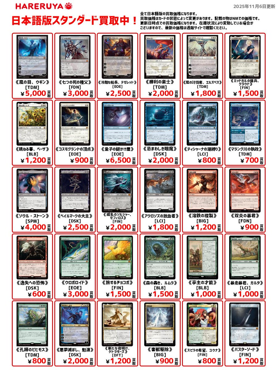 【買取情報】 ✨スタンダード買取募集中✨ 日本語版の買取価格🆙商品はコチラ 《忌まわしき眼魔》[DSK] ¥2,000 《威名のソルジャー、セフィロス》[FIN] ¥2,000 《アクロゾズの放血者》[LCI] ¥1,800 《旅するチョコボ》[FIN] ¥1,500 1枚でも多数でも大歓迎です‼️ 皆さまのご来店お待ちしております🙇♀️