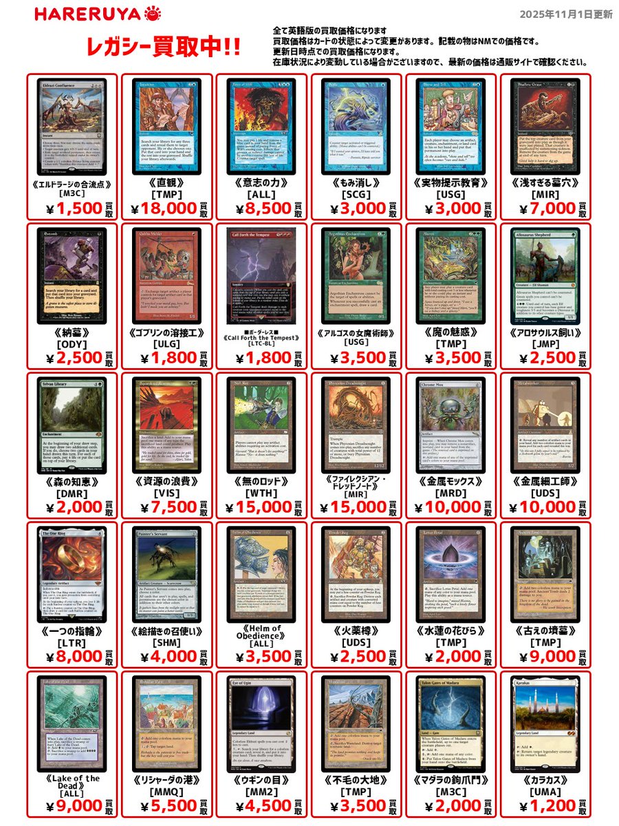 【買取情報】 🏛️レガシー買取募集中🏛️ 英語版参考価格はこちら🔽 《直観》[TMP] ¥18,000 《資源の浪費》[VIS] ¥7,500 《リシャーダの港》[MMQ] ¥5,500 《水蓮の花びら》[TMP] ¥2,000 昔遊んでいたカードが高くなっているかも⁉️ ぜひ『晴れる屋郡山店』までお持ち込みください✨