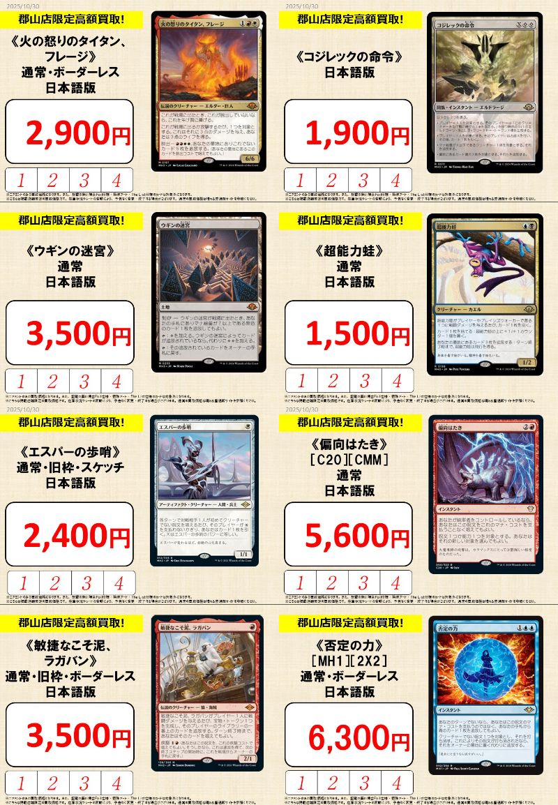 【買取情報】 『晴れる屋 郡山店』限定買取更新しました‼️ 🎯注目のカード🎯 《ウギンの迷宮》¥3,500 《エスパーの歩哨》¥2,400 《敏捷なこそ泥、ラガバン》¥3,500 《否定の力》¥6,300 売っておくなら今の内かも?🤔 お持ち込み、お待ちしております🎵