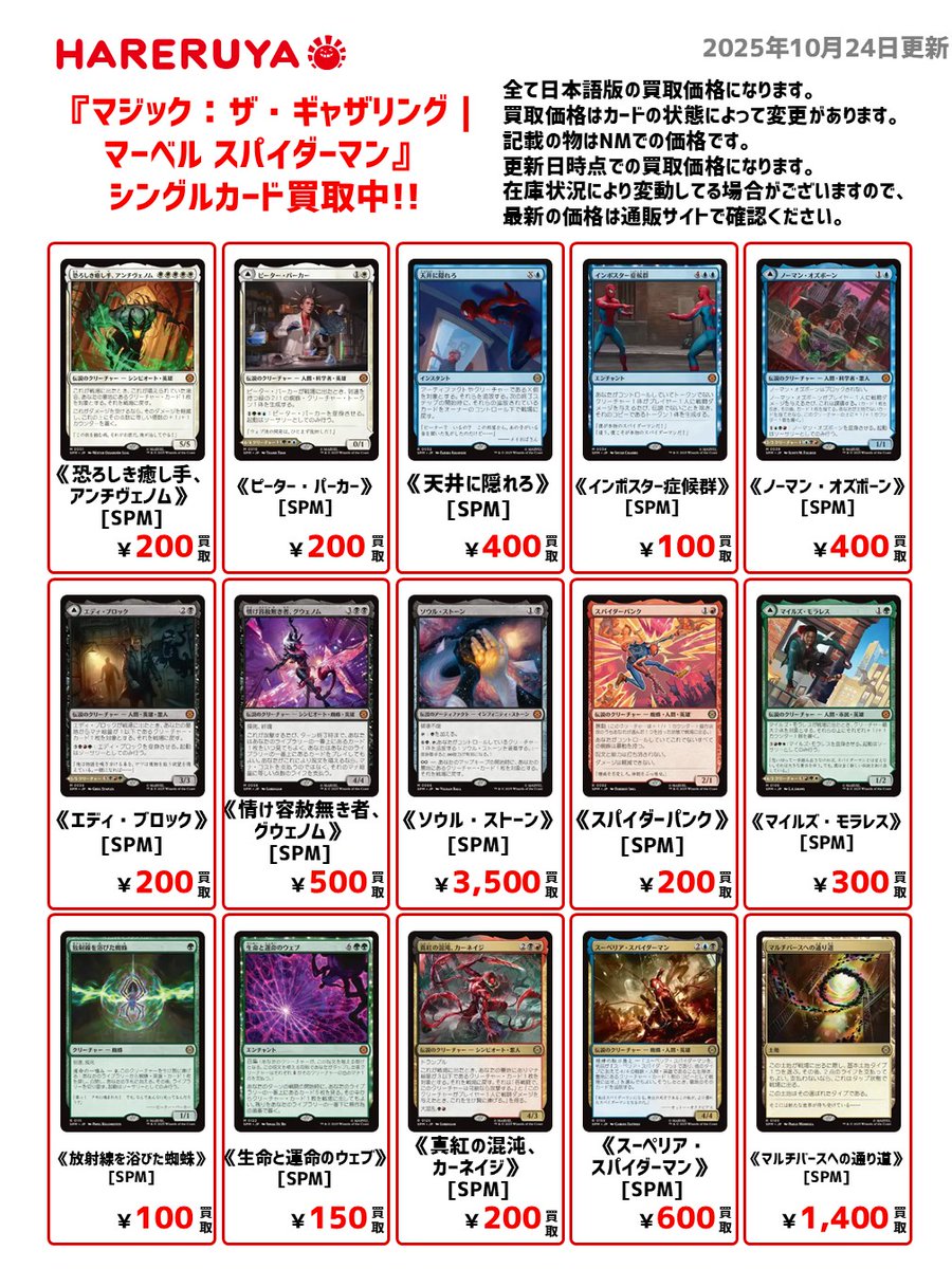 【買取情報】 🕷️『マーベル スパイダーマン』買取募集中🕷️ 日本語版の買取参考価格はコチラ🔽 《ソウル・ストーン》[SPM] ¥3,500 《マルチバースへの通り道》[SPM] ¥1,400 《真紅の混沌、カーネイジ》[SPM] ¥200 1枚でも大量でも大歓迎です💪 ドシドシお持ち込みください‼️💥