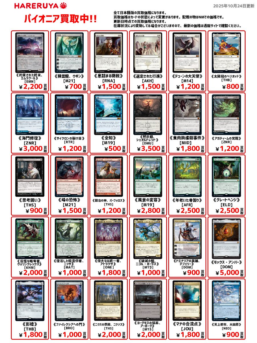【買取情報】 🔧パイオニア買取募集中です🔧 日本語版の参考価格はこちら🔽 《モックス・アンバー》[DOM] ¥5,000 《海門修復》[ZNR] ¥3,000 《マナの合流点》[JOU] ¥1,800 《アガディームの覚醒》[ZNR] ¥1,200 《太陽冠のヘリオッド》[THB] ¥800 ご来店・お持ち込み、お待ちしております🙇♀️