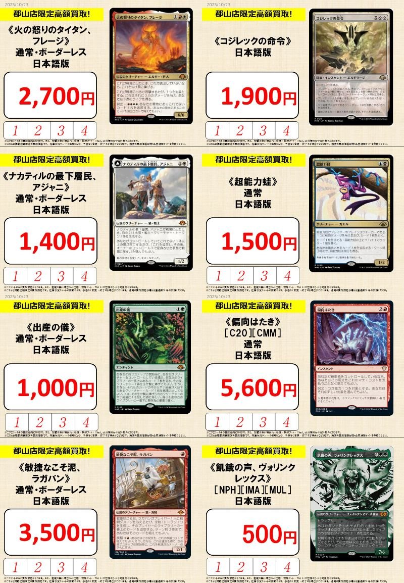 【買取情報】 晴れる屋郡山店限定の買取強化実施中‼️ 《コジレックの命令》¥1,900 《ナカティルの最下層民、アジャニ》¥1,400 《偏向はたき》¥5,600 《飢餓の声、ヴォリンクレックス》¥500 統率者用カードも強化買取‼️ 1枚からでもじゃんじゃんお持ち込みください💪 ご来店お待ちしております😆