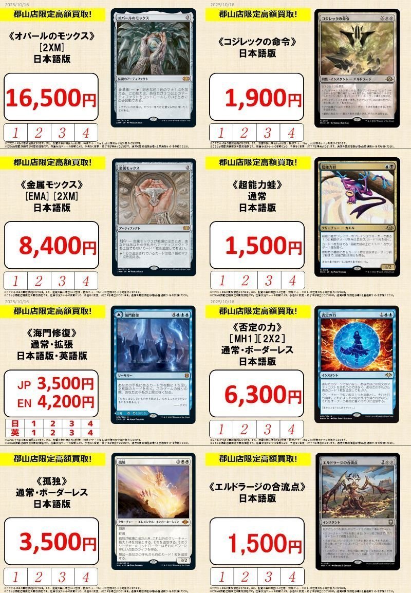 【買取情報】 晴れる屋郡山店限定の買取強化実施中‼️ 《オパールのモックス》¥16,500 《金属モックス》¥8,400 《海門修復》JP ¥3,500/EN ¥4,200 《否定の力》¥6,300 《エルドラージの合流点》¥1,500 1枚からでもじゃんじゃんお持ち込みください💪 ご来店お待ちしております😆