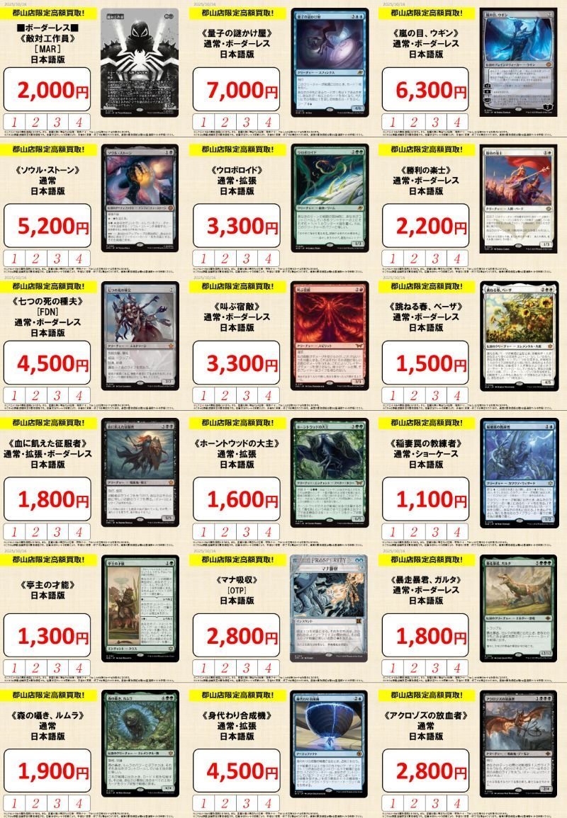 【買取情報】 『晴れる屋郡山店』限定の買取強化実施中‼️ 《量子の謎かけ屋》¥7,000 《嵐の目、ウギン》¥1,500 《ウロボロイド》¥3,300 《ホーントウッドの大主》¥1,600 《マナ吸収》[OTP]¥2,800 ぜひ『晴れる屋郡山店』までお持ち込みください🤩