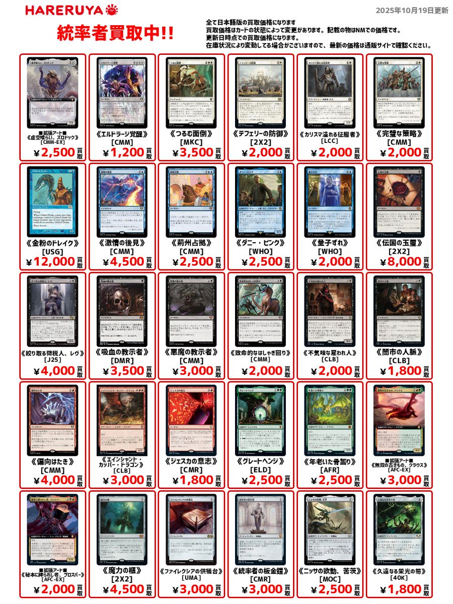 【買取情報】 👑統率者買取募集中👑 日本語版の参考買取価格はコチラ🔽 《金粉のドレイク》[USG] ¥12,000 《伝国の玉璽》[2X2] ¥8,000 《つるむ面倒》[MKC] ¥3,500 《ダニー・ピンク》[WHO] ¥2,500 《量子ずれ》[WHO] ¥2,000 査定は1⃣枚から承ります✨ ぜひ『晴れる屋郡山店』へお持ち込みください🙇♀️
