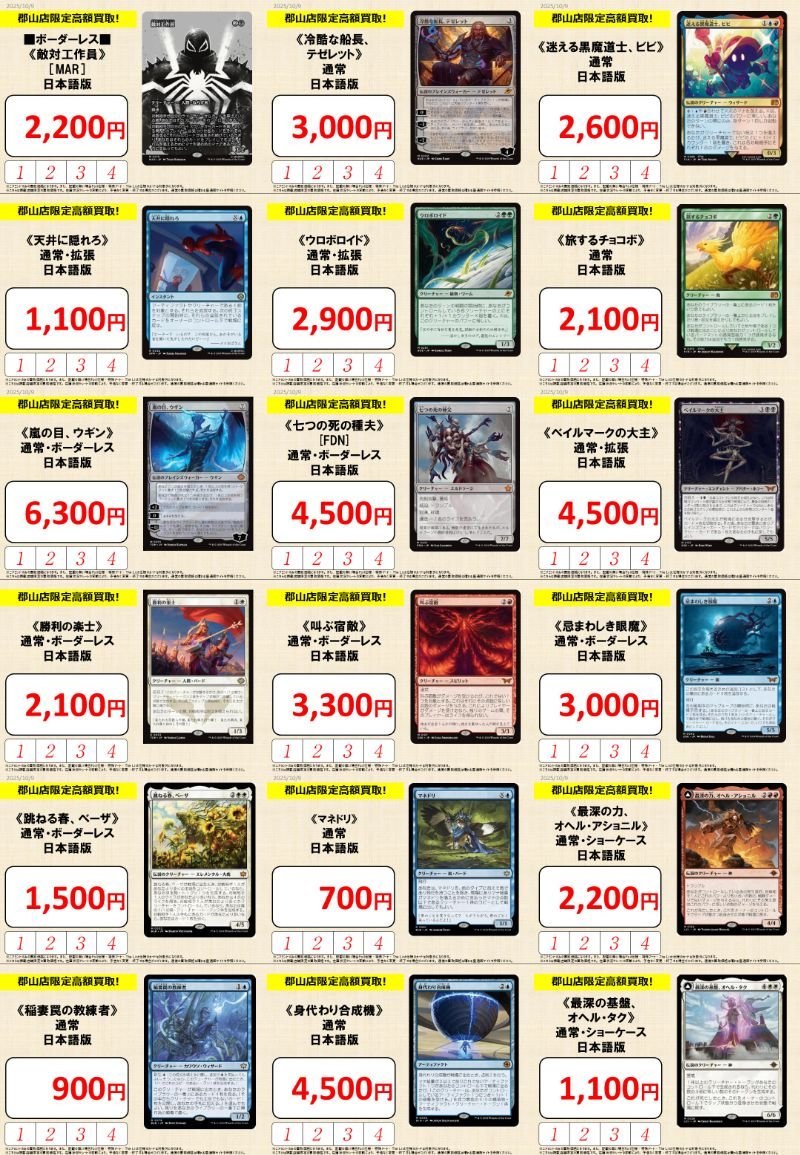【買取情報】 『晴れる屋 郡山店』限定買取更新しました 🎯注目のカード🎯 《迷える黒魔道士、ビビ》¥2,600 《ウロボロイド》¥2,900 《七つの死の種夫》¥4,500 《最深の力、オヘル・アショニル》¥2,200 《稲妻罠の教練者》¥900 買取はアティ郡山8F『晴れる屋郡山店』までお持ち込みください😆