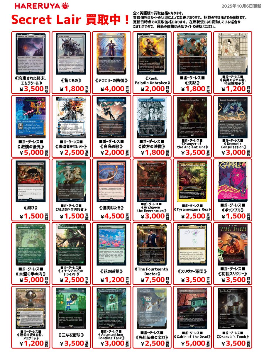 【買取情報】 🧙♂️『Secret Lair』買取募集中🧙♂️ 英語・通常版の買取値🆙商品はコチラ🔽 (371)■ボーダーレス■《木霊の手の内》[SLD] ¥5,000 (372)■ボーダーレス■《先祖伝来の宝刀》[SLD] ¥2,500 (188)■ボーダーレス■《ギャンブル》[SLD] ¥1,500 皆さまのお持ち込み、お待ちしております‼️