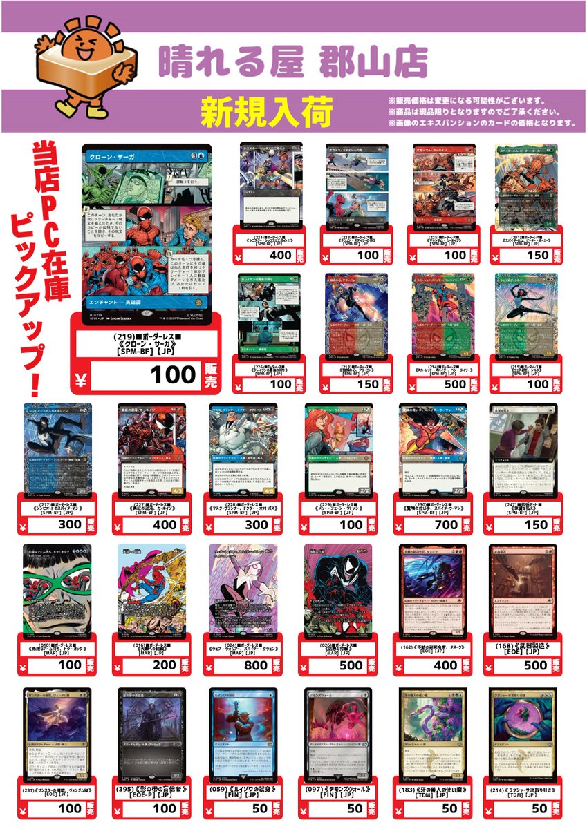 【#晴れ郡商品情報】 🔥ストレージコーナーにカードをさらに6⃣0⃣0⃣枚以上追加‼️🔥 🎯今回のおススメ 《ウェブスリンガー、スパイダーマン》¥100 《洞窟探検》¥100 《Space Beleren》¥100 SPM フルアート基本土地[Foil] ¥100 週末大会の合間に覗いてみてくださいね👀 ご来店お待ちしております🙇♂️
