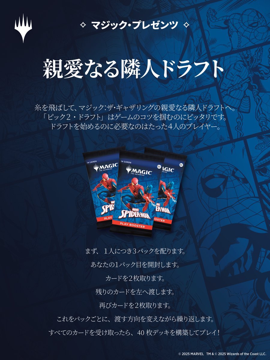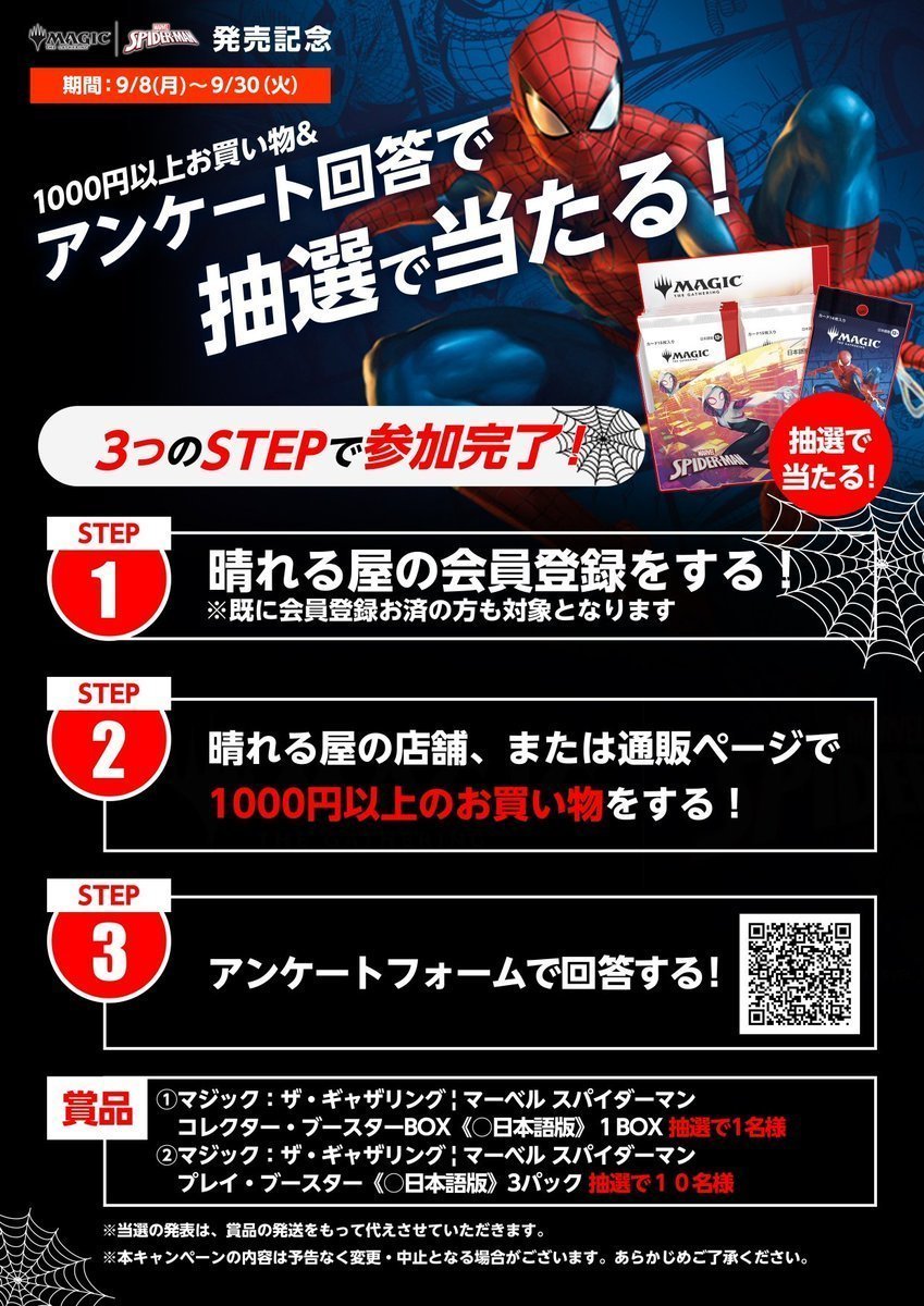【お知らせ】 『マジック:ザ・ギャザリング | マーベル スパイダーマン』発売記念キャンペーン開催🕷 ⏰期間:2025/9/30(火)まで 🔎応募条件 1⃣晴れる屋の会員登録 2⃣1000円以上のお買い物(店頭orオンライン) 3⃣アンケート回答 アンケートはコチラから🔽